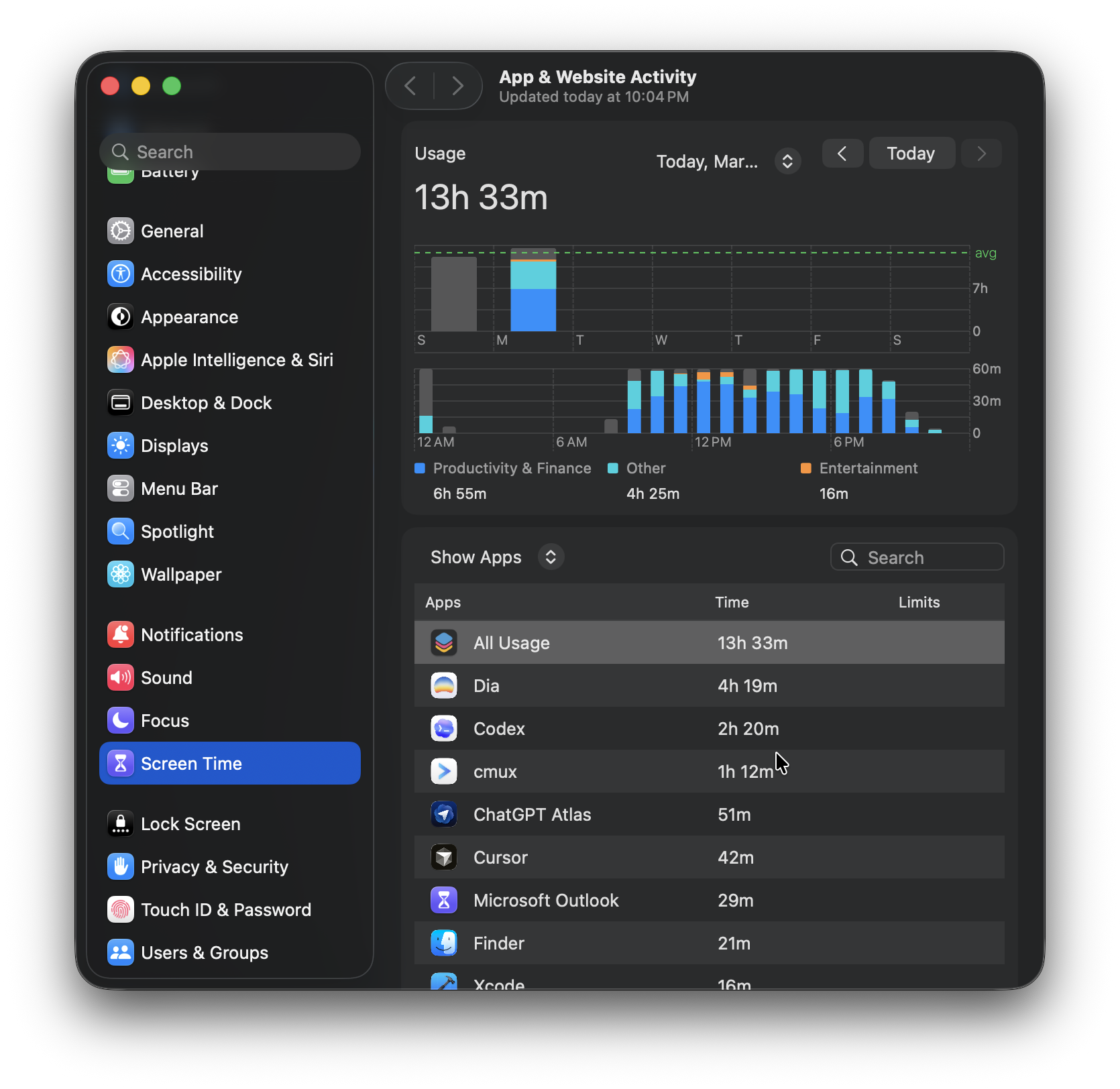 Screen Time is the obvious first stop. already there, free, no setup. but here's what you get: app names and total durations. "Dia: 4 hours 19 minutes." okay Apple, let me ask you something — why was i in Dia for 4 hours? it's like going to the doctor and they tell you "you have a problem somewhere in your body, i just can't tell where." cool, thank you, very helpful. Screen Time counts containers. not what's inside them.