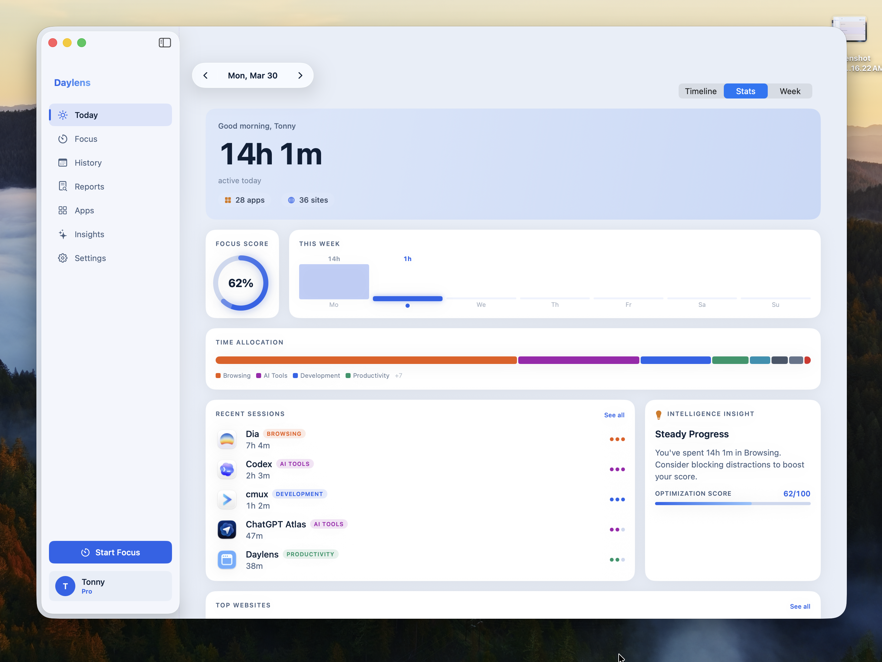 the focus score is based on your own switching behavior relative to your own history, not some external benchmark. the intelligence insight reads your actual data and surfaces what's worth knowing. it's not a generic tip generator.