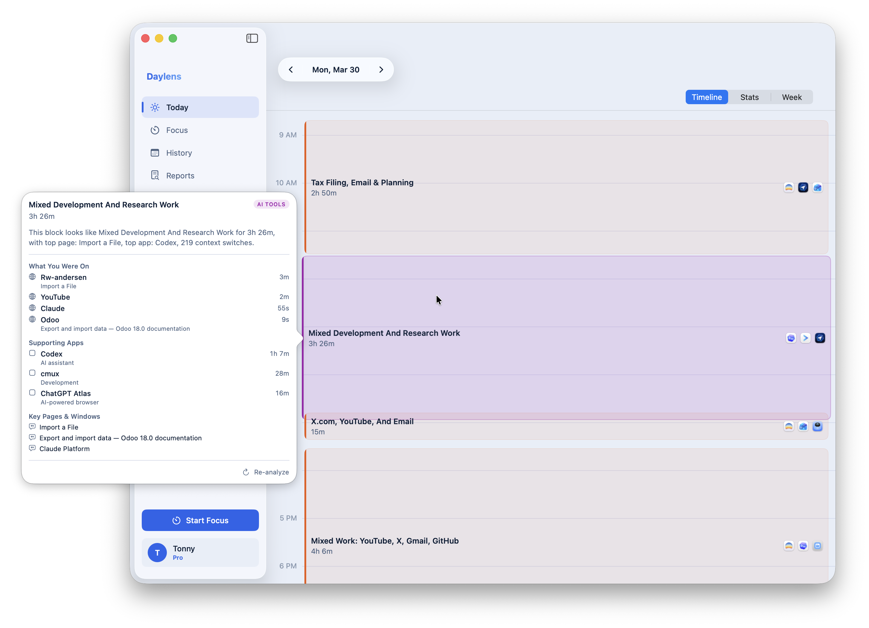 that "Mixed Development And Research Work" block isn't just a label i created. Daylens analyzed the session and understood what was happening: Codex as the primary tool for 1 hour 7 minutes, cmux for development work, Claude and Odoo pages open in the background. 219 context switches detected in that one session. the analysis runs on every block automatically, not sitting in a separate feature you have to go find and turn on.